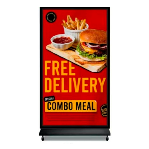 Foldable A-shape displays on wheels (32-55"). Digital A-board format: easy to move, fold, and update your advertising content.