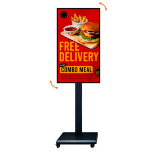 Mobile vertical standees on wheels (32-98"). Brightness 300-1000 nits, with or without touch. A wide range of models for indoor use.